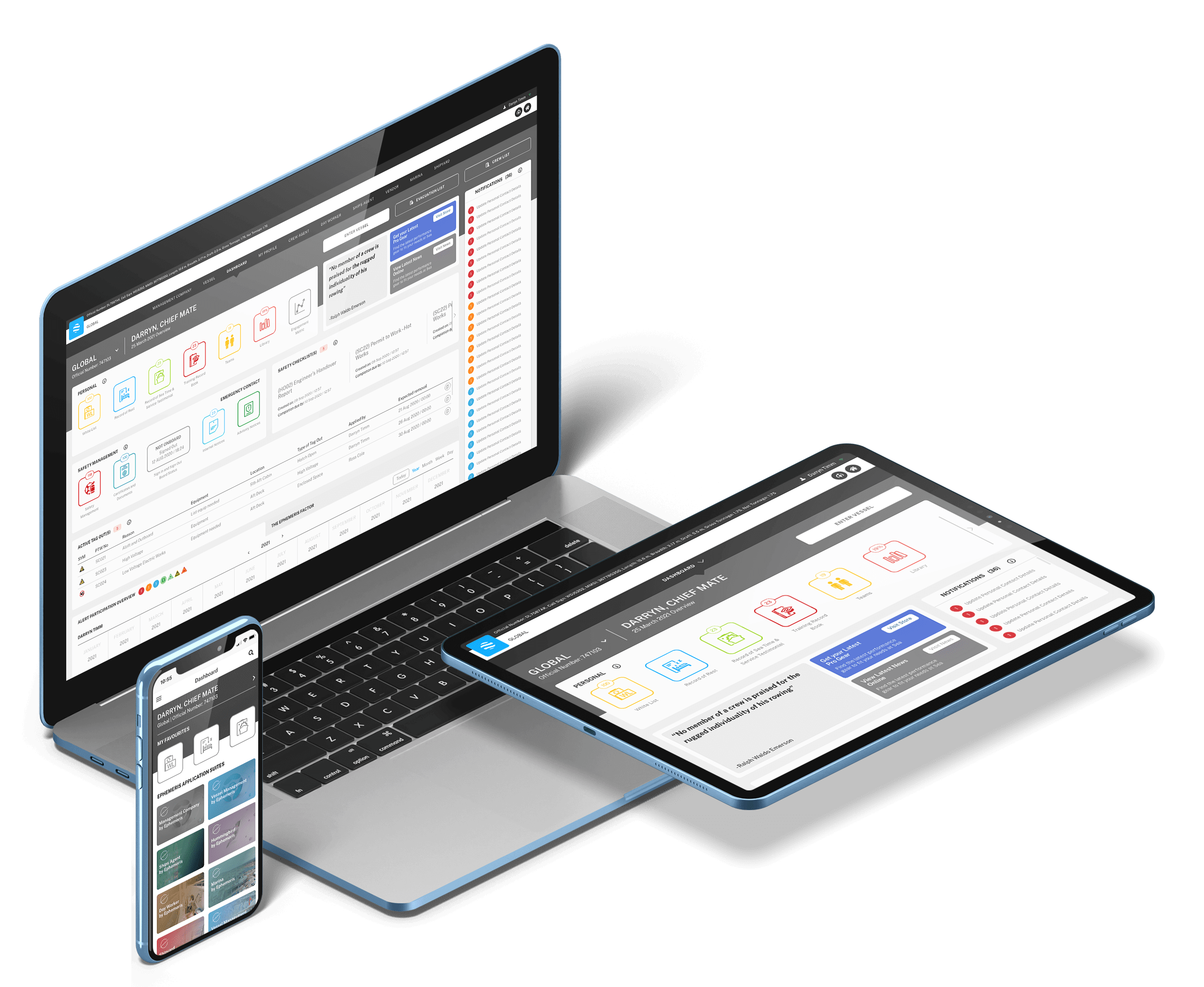 A fully integrated platform providing vessel users with easy and efficient access to tools allowing all-encompassing control of onboard operations, resources, drills and planning, and management of ISM and operational responsibilities, statutory reporting and documentation, industry notices and updates. Facilitating seamless collaboration with Management Company by Ephemeris