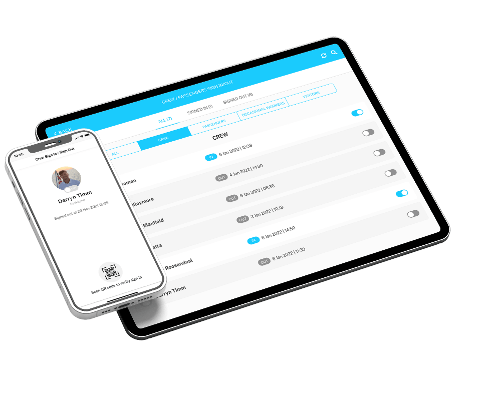Crew, Passenger and Visitors Sign In / Sign Out Interface and Evacuation List for iPad which can be placed at any or multiple vessel entrances.